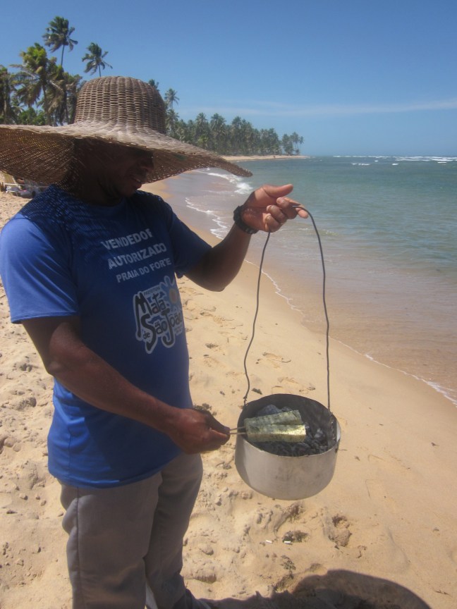 Anyway this bit of news drew my mind to a daydreaming state of Brazilian coastline, sunshine, bright colors and basically lulling the day away to whatever my heart desired. Some of these lulls were filled by taking it to the playa (beach) donning a swim suit, a kanga (popular with the locals, basically a sarong) and a floppy straw hat (not to mention slathered in spf 50 for my pale skin!) Brazilians understand how to beach….none of this– let’s just lay here and flip and tan and flip and tan….no no no they have fun umbrellas and food stands and cheese grillers and beer! Sure you had the option of just flipping and tanning but they offer so much more!