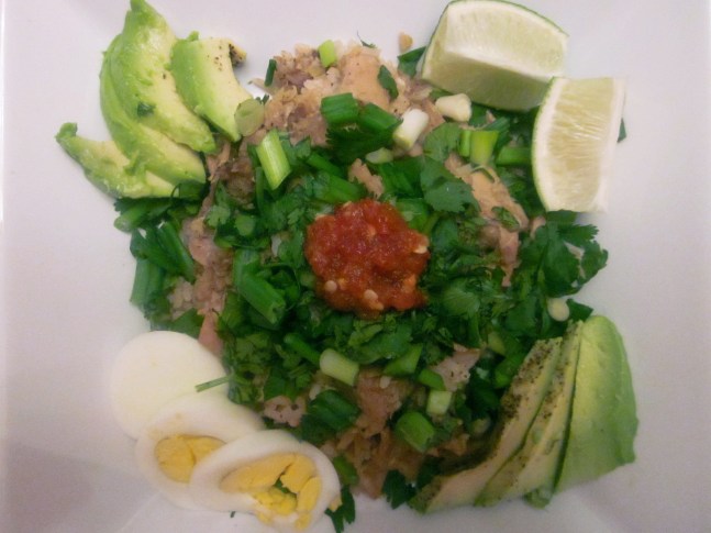 Pile rice on a serving dish, top with the cooked chicken then adorn with the chopped cilantro and green onion. Surround the dish with sliced hard-boiled eggs, avocado and lime wedges. Add a dollop of chili sauce on top and EAT!