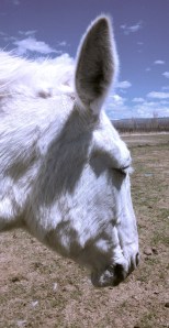 My mule of choice was Irene an older, bedraggled, pure white and oh so shedding lady. Irene was a former trick mule and not cared for very well. I noticed her scarring most likely from rough handling during her trick days. Irene was shy at first but I built up her trust in me and before long we felt like old friends, me brushing her coat, she nuzzling me with her fuzzy nose.