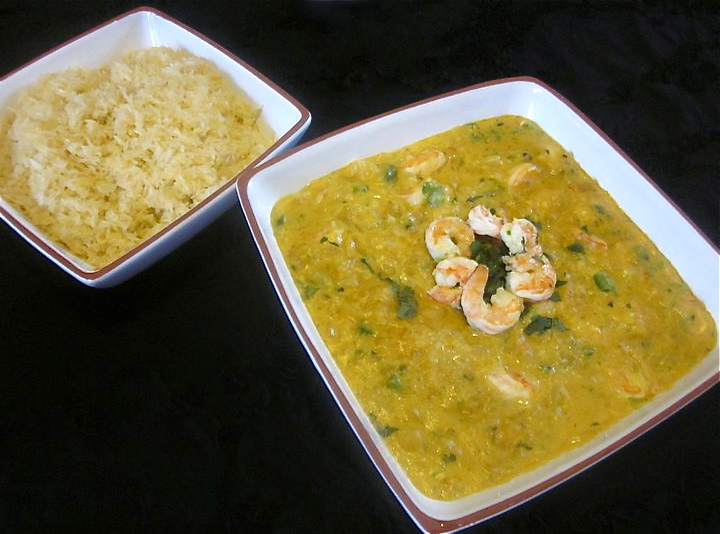 Prepare the shrimp: Rinse the shrimp well in plenty of cold running water. Drain. In a large, deep saucepan combine the drained shrimp, chopped garlic, salt, cilantro, tomatoes, onions, green pepper and the olive oil. Heat over medium high heat, stirring frequently. When hot, add the coconut milk in 1/2 cup amounts, stirring after each addition to completely mix. Continue to cook for 5 minutes more, stirring constantly.