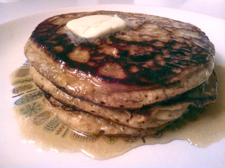 While the pancakes are still warm, top with a dollop of butter so it melts over the top of the pancakes. Serve with real maple syrup!
