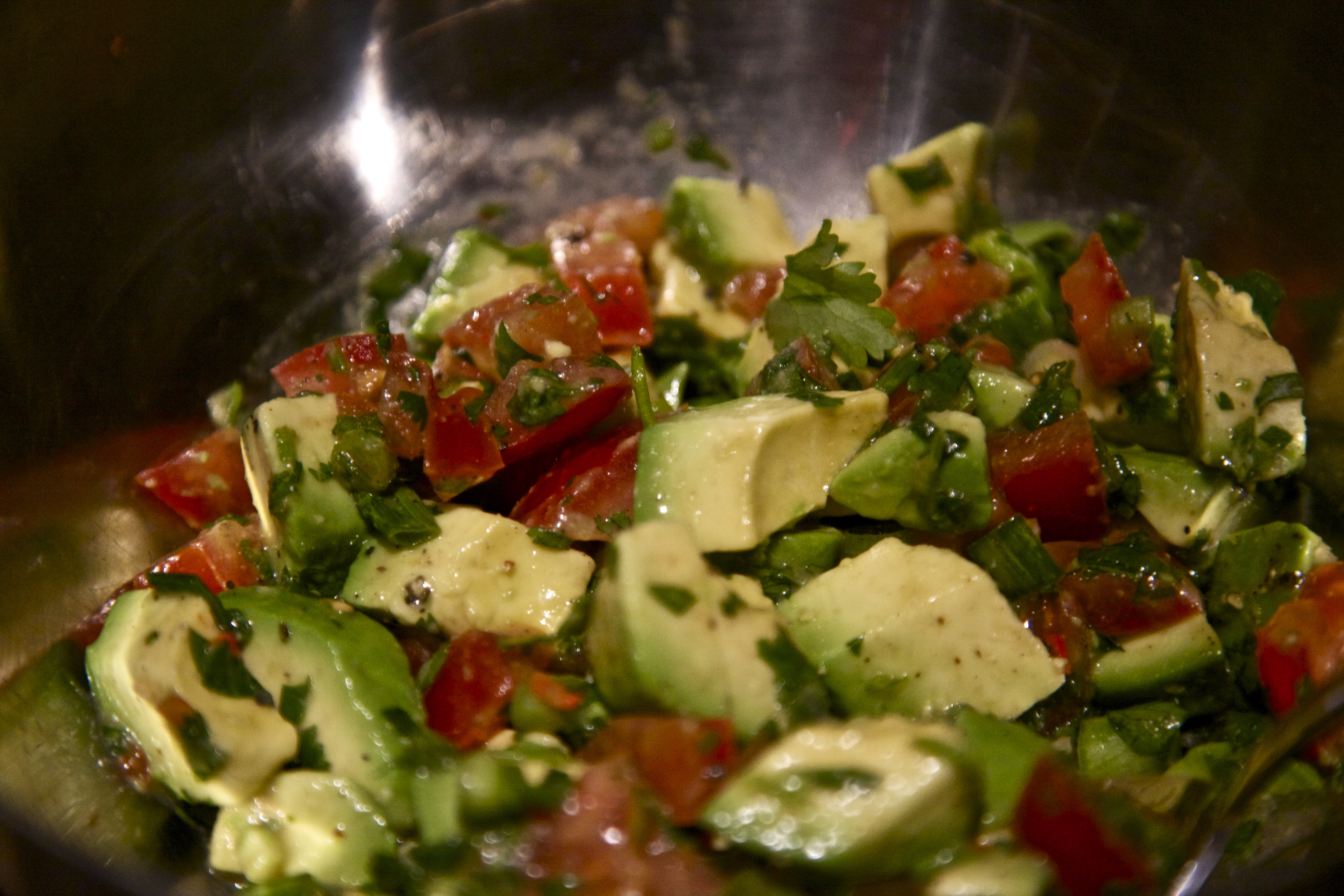 In a bowl, mix the following ingredients: Green Onion, Green Chili, Tomato, Cilantro, Cumin, and Black Pepper, Then add in the lime juice and salt and mix again. Finally, gently add the diced avocado being careful not to mash it. Serve cold or at room temperature.