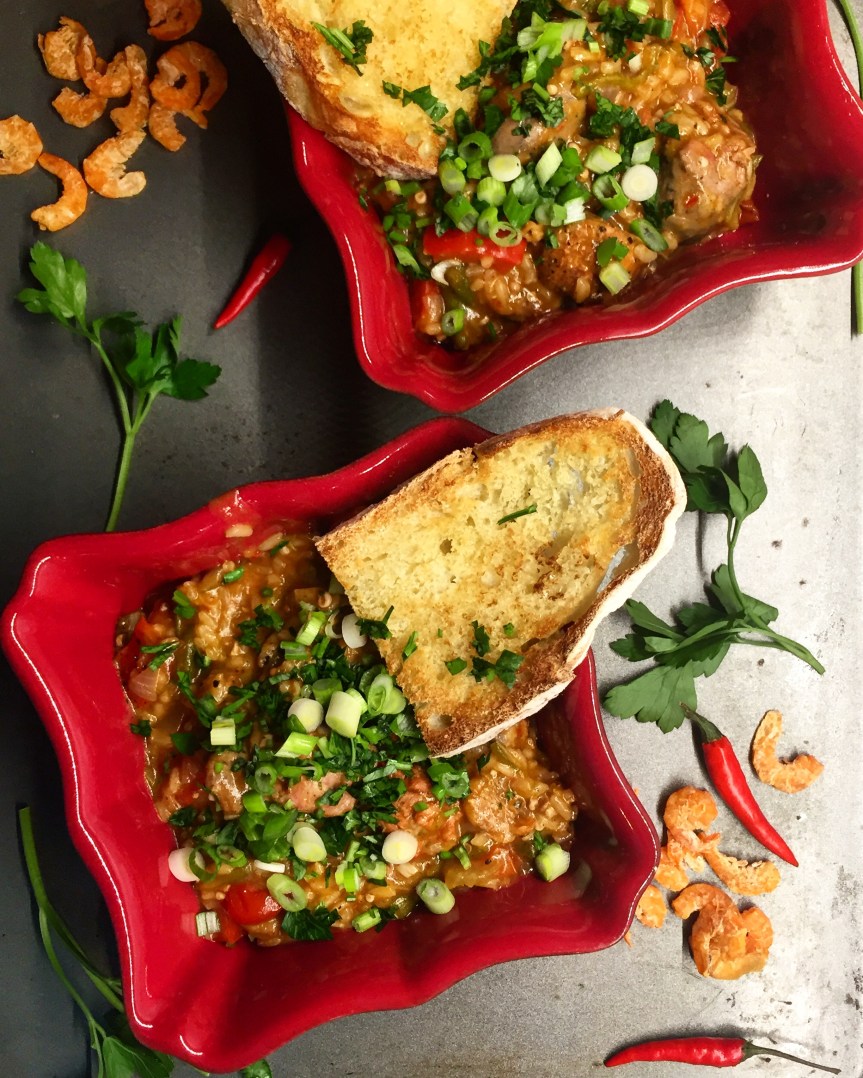 Juicy chunks of browned sausage, bright green okra, red tomatoes, bell peppers, onion, garlic, shrimp and rice. A one pot meal that’s simple and layered with flavor. I didn’t have fresh shrimp on hand, so I added a handful of dried shrimp which I keep in my pantry to give my gumbo a bit of an umami edge. By all means, be traditional and use fresh shrimp if you have them, better yet if you have the time use the heads and shells to prepare a stock to season the gumbo.