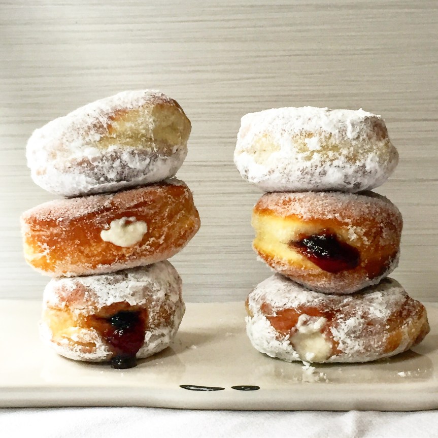 I used three different fillings: A black cherry jam which I acquired on a trip to Paris, sweetened ricotta (ricotta, confectioner’s sugar, rum, orange zest) and my favorite, prune butter (1 cup dried prunes, 4 Tbsp fresh orange juice, 1/2 cup water, 1/4 cup brown sugar, orange zest, pinch of salt. Bring all ingredients to a boil, then simmer 30 minutes, puree with an immersion blender) I didn’t have a pastry bag, so I DIYed it by cutting off the corners of plastic Zip-Loc bags and using them as make-shift pastry bags.